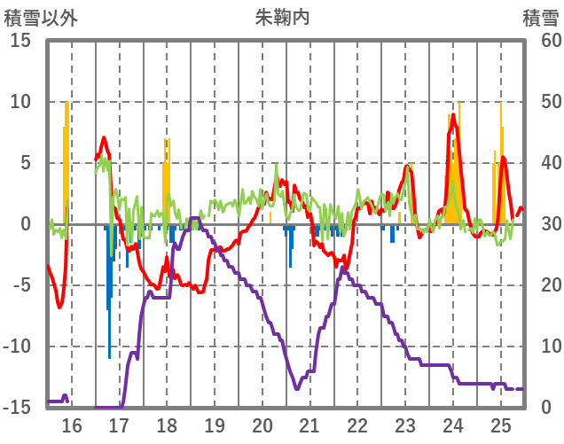 | 日 | 時 | 気温 | 降水 | 風向/風速 | 日照 | 積雪 | 降雪 |