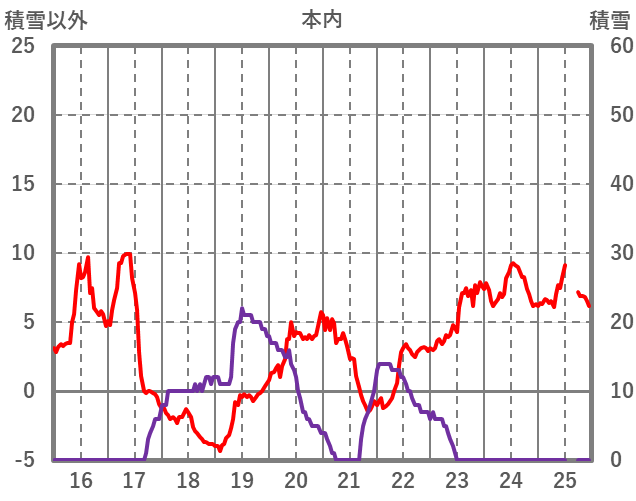 | 日 | 時 | 気温 | 降水 | 風向/風速 | 日照 | 積雪 | 降雪 |