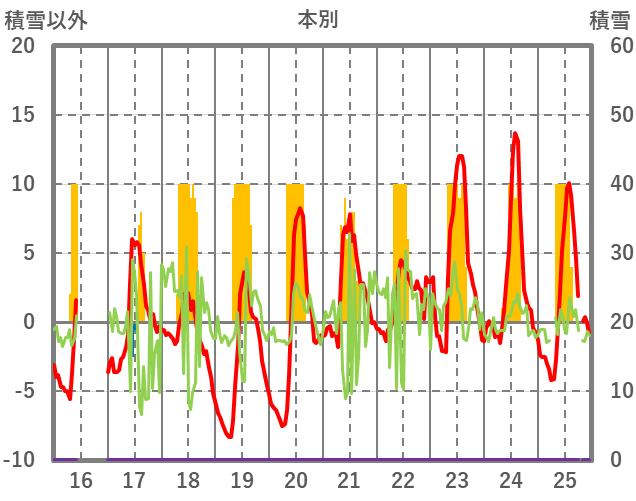 | 日 | 時 | 気温 | 降水 | 風向/風速 | 日照 | 積雪 | 降雪 |