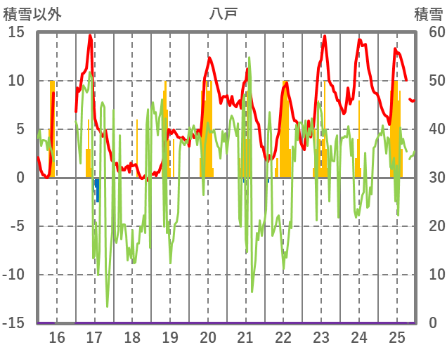 | 日 | 時 | 気温 | 降水 | 風向/風速 | 日照 | 積雪 | 降雪 |