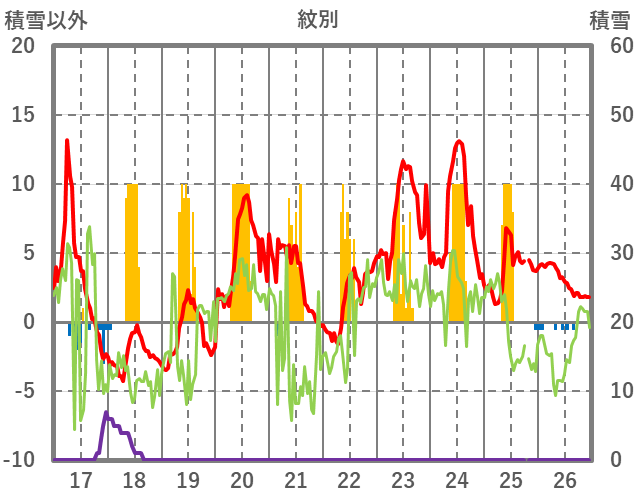 | 日 | 時 | 気温 | 降水 | 風向/風速 | 日照 | 積雪 | 降雪 |