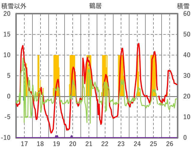 | 日 | 時 | 気温 | 降水 | 風向/風速 | 日照 | 積雪 | 降雪 |