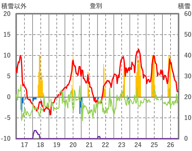 | 日 | 時 | 気温 | 降水 | 風向/風速 | 日照 | 積雪 | 降雪 |