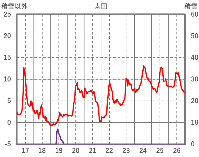 | 日 | 時 | 気温 | 降水 | 風向/風速 | 日照 | 積雪 | 降雪 |