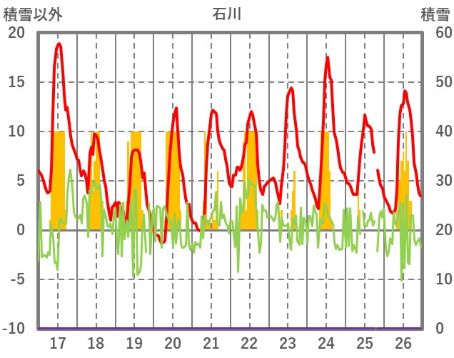 | 日 | 時 | 気温 | 降水 | 風向/風速 | 日照 | 積雪 | 降雪 |