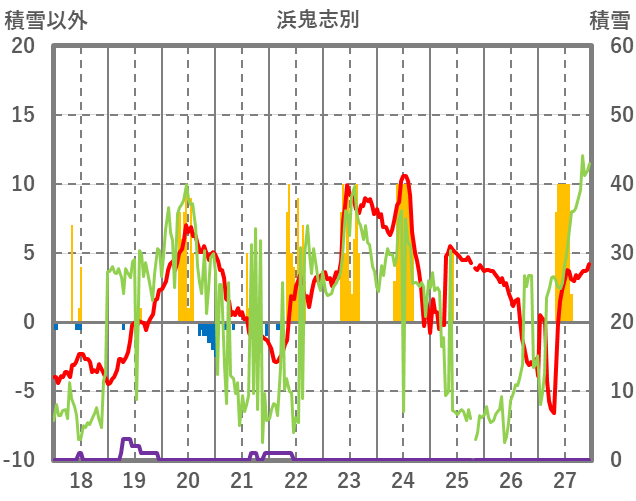 | 日 | 時 | 気温 | 降水 | 風向/風速 | 日照 | 積雪 | 降雪 |