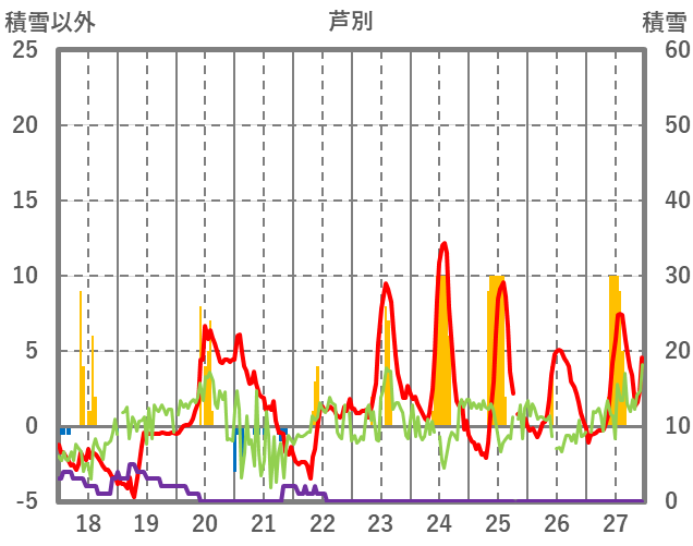 | 日 | 時 | 気温 | 降水 | 風向/風速 | 日照 | 積雪 | 降雪 |