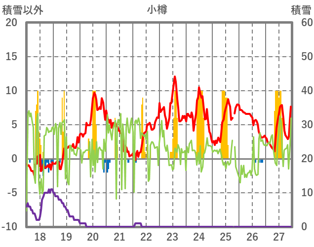 | 日 | 時 | 気温 | 降水 | 風向/風速 | 日照 | 積雪 | 降雪 |