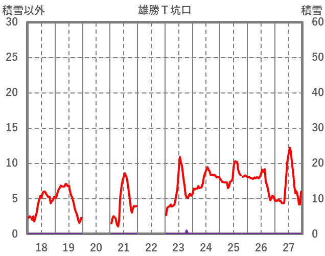 | 日 | 時 | 気温 | 降水 | 風向/風速 | 日照 | 積雪 | 降雪 |