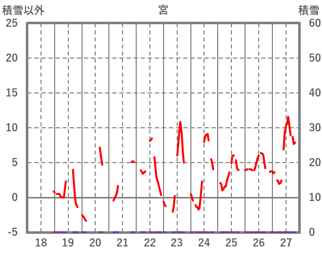 | 日 | 時 | 気温 | 降水 | 風向/風速 | 日照 | 積雪 | 降雪 |