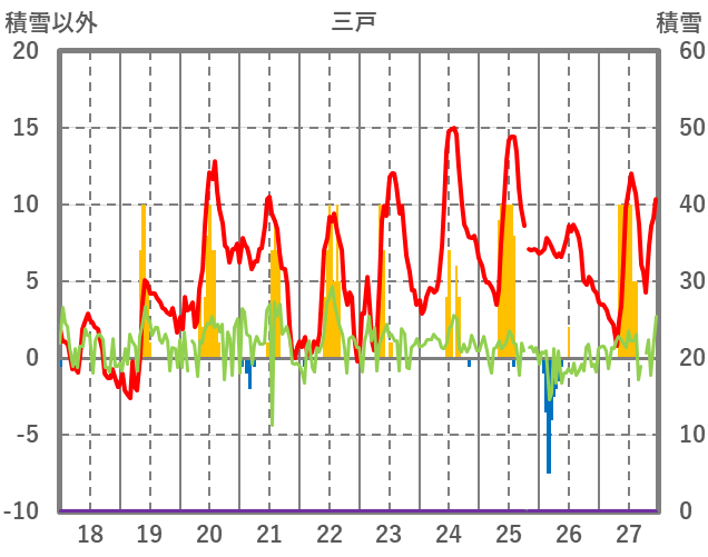 | 日 | 時 | 気温 | 降水 | 風向/風速 | 日照 | 積雪 | 降雪 |