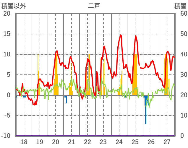 | 日 | 時 | 気温 | 降水 | 風向/風速 | 日照 | 積雪 | 降雪 |