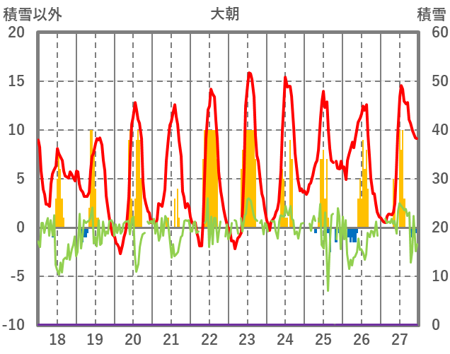 | 日 | 時 | 気温 | 降水 | 風向/風速 | 日照 | 積雪 | 降雪 |