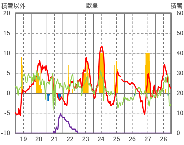 | 日 | 時 | 気温 | 降水 | 風向/風速 | 日照 | 積雪 | 降雪 |
