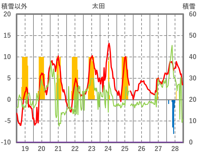 | 日 | 時 | 気温 | 降水 | 風向/風速 | 日照 | 積雪 | 降雪 |
