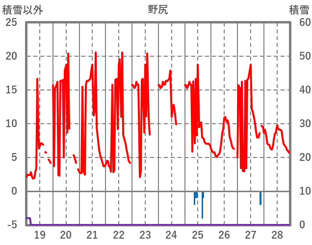 | 日 | 時 | 気温 | 降水 | 風向/風速 | 日照 | 積雪 | 降雪 |