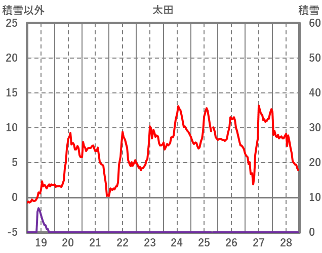 | 日 | 時 | 気温 | 降水 | 風向/風速 | 日照 | 積雪 | 降雪 |