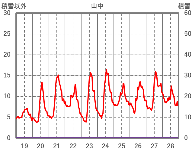 | 日 | 時 | 気温 | 降水 | 風向/風速 | 日照 | 積雪 | 降雪 |