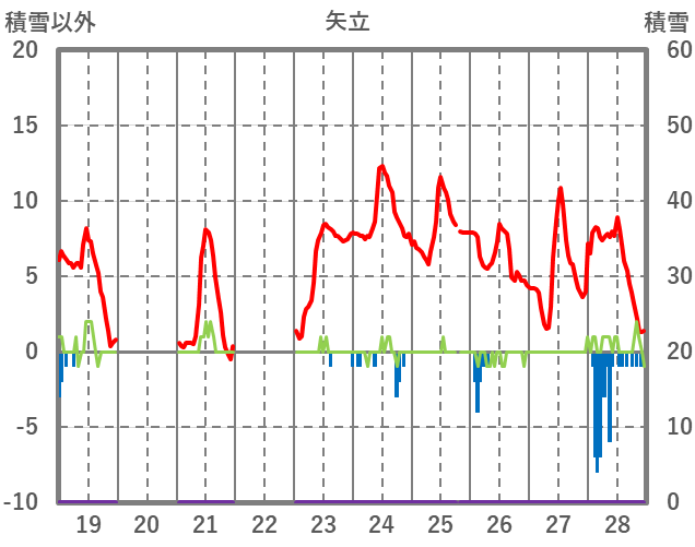 | 日 | 時 | 気温 | 降水 | 風向/風速 | 日照 | 積雪 | 降雪 |