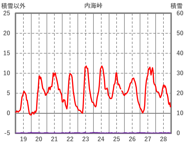 | 日 | 時 | 気温 | 降水 | 風向/風速 | 日照 | 積雪 | 降雪 |