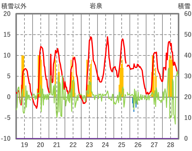 | 日 | 時 | 気温 | 降水 | 風向/風速 | 日照 | 積雪 | 降雪 |