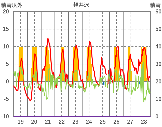 | 日 | 時 | 気温 | 降水 | 風向/風速 | 日照 | 積雪 | 降雪 |