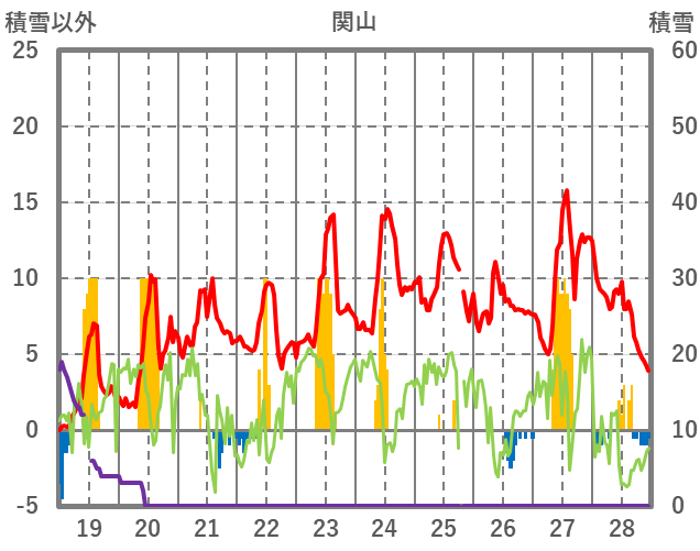 | 日 | 時 | 気温 | 降水 | 風向/風速 | 日照 | 積雪 | 降雪 |