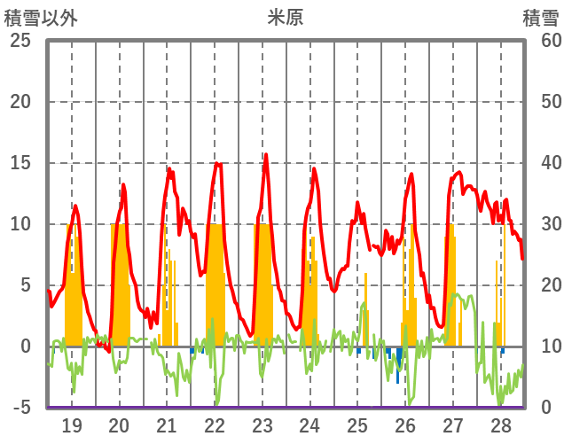| 日 | 時 | 気温 | 降水 | 風向/風速 | 日照 | 積雪 | 降雪 |