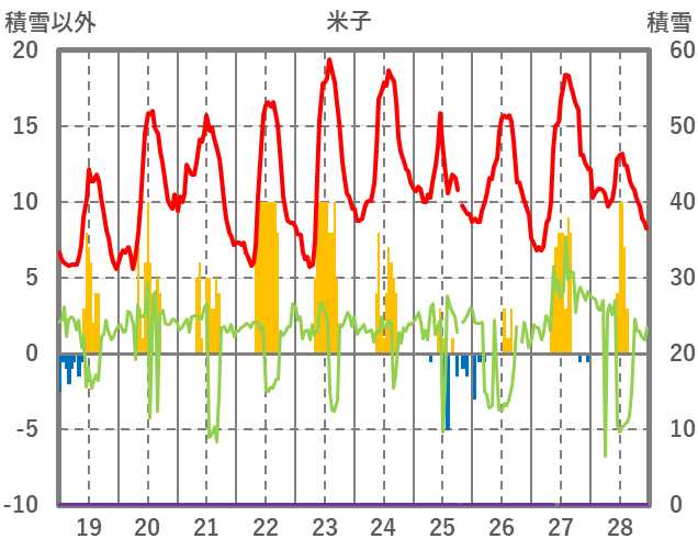 | 日 | 時 | 気温 | 降水 | 風向/風速 | 日照 | 積雪 | 降雪 |