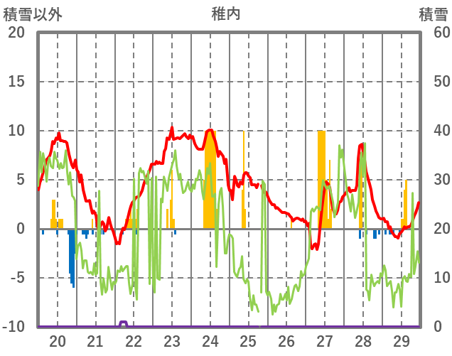 | 日 | 時 | 気温 | 降水 | 風向/風速 | 日照 | 積雪 | 降雪 |