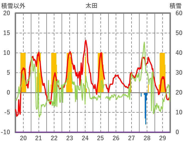 | 日 | 時 | 気温 | 降水 | 風向/風速 | 日照 | 積雪 | 降雪 |