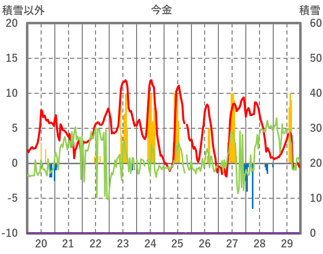 | 日 | 時 | 気温 | 降水 | 風向/風速 | 日照 | 積雪 | 降雪 |
