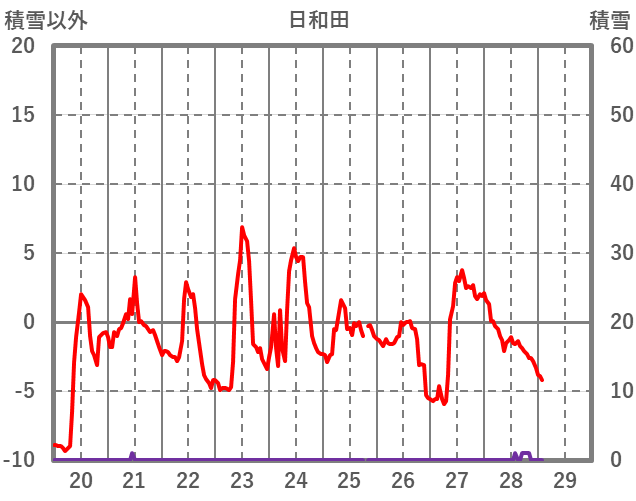 | 日 | 時 | 気温 | 降水 | 風向/風速 | 日照 | 積雪 | 降雪 |