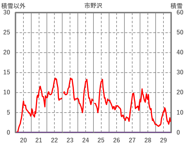 | 日 | 時 | 気温 | 降水 | 風向/風速 | 日照 | 積雪 | 降雪 |