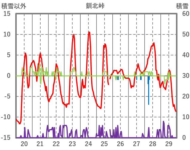 | 日 | 時 | 気温 | 降水 | 風向/風速 | 日照 | 積雪 | 降雪 |