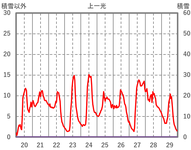 | 日 | 時 | 気温 | 降水 | 風向/風速 | 日照 | 積雪 | 降雪 |