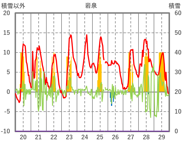| 日 | 時 | 気温 | 降水 | 風向/風速 | 日照 | 積雪 | 降雪 |