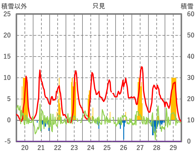 | 日 | 時 | 気温 | 降水 | 風向/風速 | 日照 | 積雪 | 降雪 |