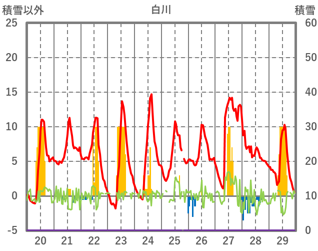 | 日 | 時 | 気温 | 降水 | 風向/風速 | 日照 | 積雪 | 降雪 |