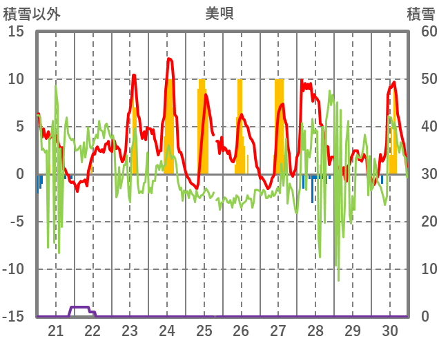 | 日 | 時 | 気温 | 降水 | 風向/風速 | 日照 | 積雪 | 降雪 |
