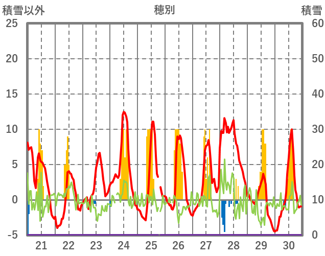| 日 | 時 | 気温 | 降水 | 風向/風速 | 日照 | 積雪 | 降雪 |