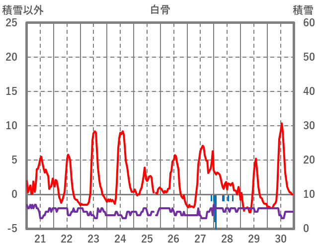 | 日 | 時 | 気温 | 降水 | 風向/風速 | 日照 | 積雪 | 降雪 |