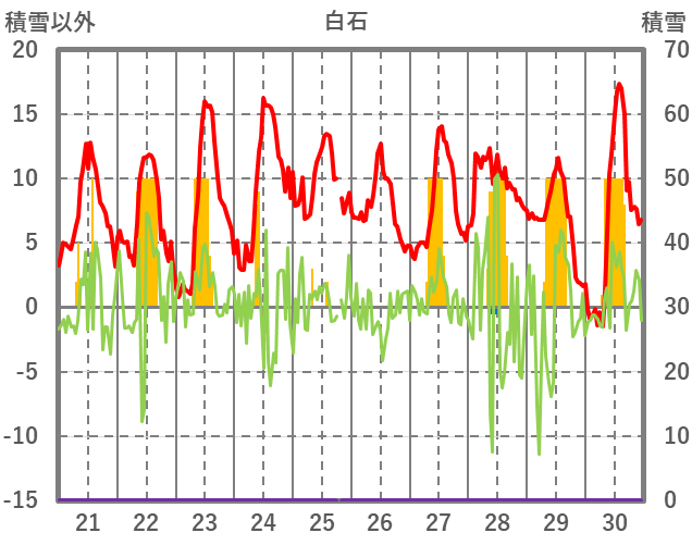 | 日 | 時 | 気温 | 降水 | 風向/風速 | 日照 | 積雪 | 降雪 |