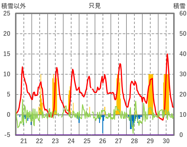 | 日 | 時 | 気温 | 降水 | 風向/風速 | 日照 | 積雪 | 降雪 |