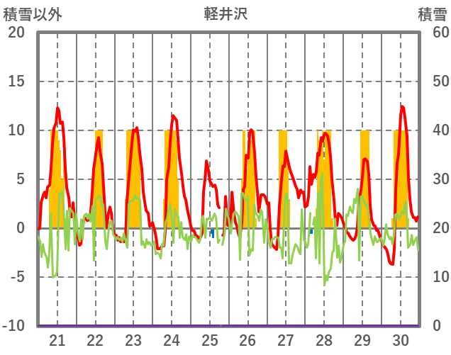 | 日 | 時 | 気温 | 降水 | 風向/風速 | 日照 | 積雪 | 降雪 |