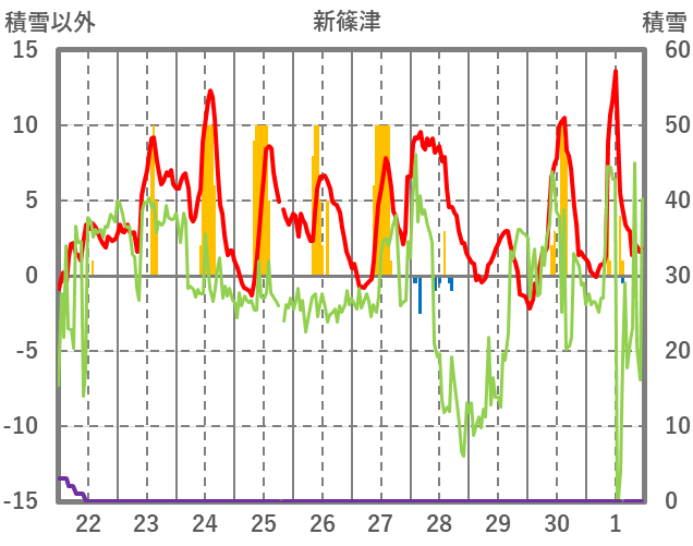 | 日 | 時 | 気温 | 降水 | 風向/風速 | 日照 | 積雪 | 降雪 |