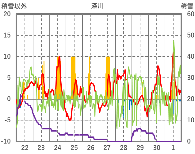 | 日 | 時 | 気温 | 降水 | 風向/風速 | 日照 | 積雪 | 降雪 |