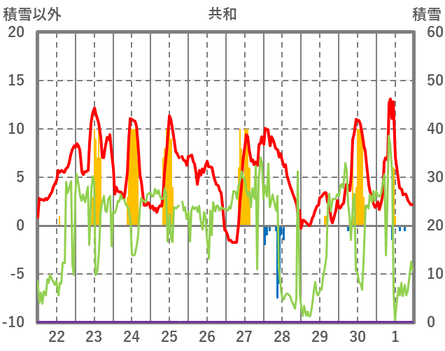 | 日 | 時 | 気温 | 降水 | 風向/風速 | 日照 | 積雪 | 降雪 |