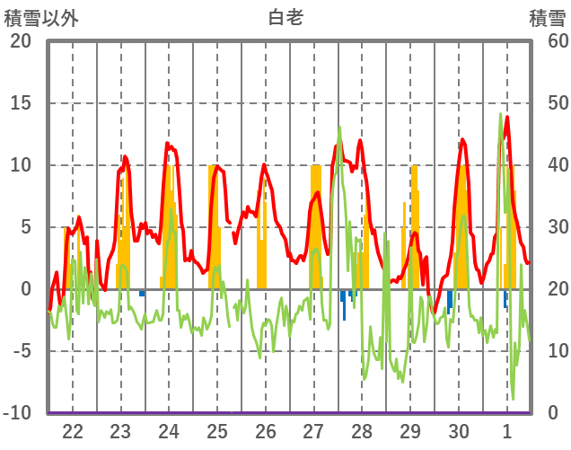 | 日 | 時 | 気温 | 降水 | 風向/風速 | 日照 | 積雪 | 降雪 |