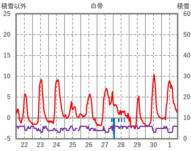| 日 | 時 | 気温 | 降水 | 風向/風速 | 日照 | 積雪 | 降雪 |
